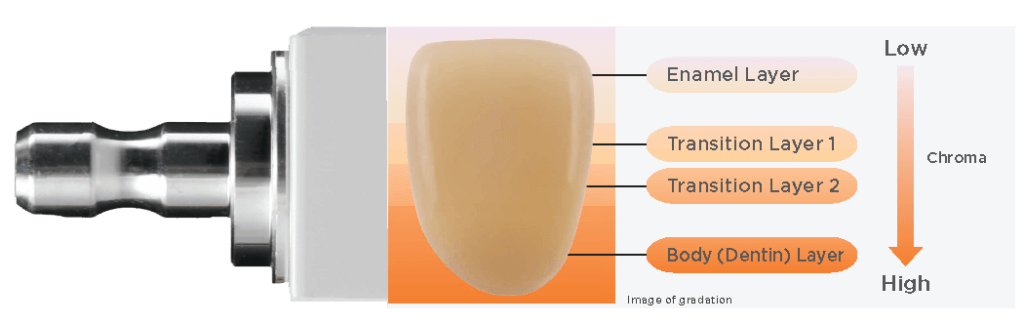 The multi-layered KATANA™ Zirconia Block consists of four layers of zirconia in gradated shades. This product allows the chair side fabrication of natural-tooth-colored restorations – eliminating additional sintering time.